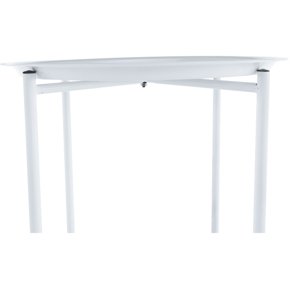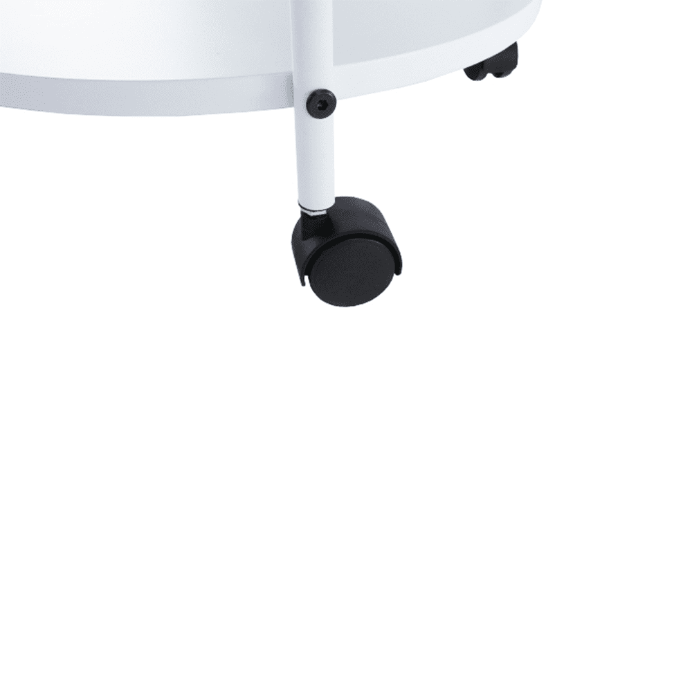 Bela stranska mizica DERIN na kolesih. Material MDF / kovina. Dimenzije (premerxV): 43,6×52,5 cm Debelina materiala: 15 mm Celoten opis