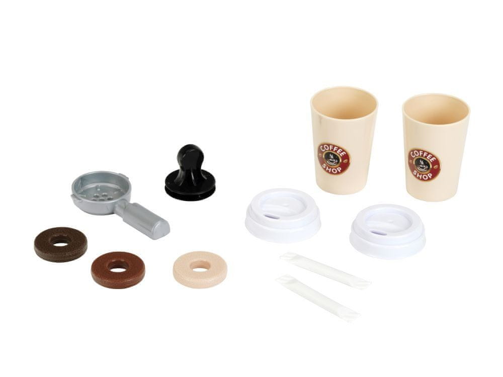 MM – Baristični aparat za espresso s posodo za vodo in funkcijo pretoka vode. 2 x skodelica za kavo s pokrovom – portafilter – 3 kavne kapsule – 2 x vrečka za sladkor – penilnik za kavo