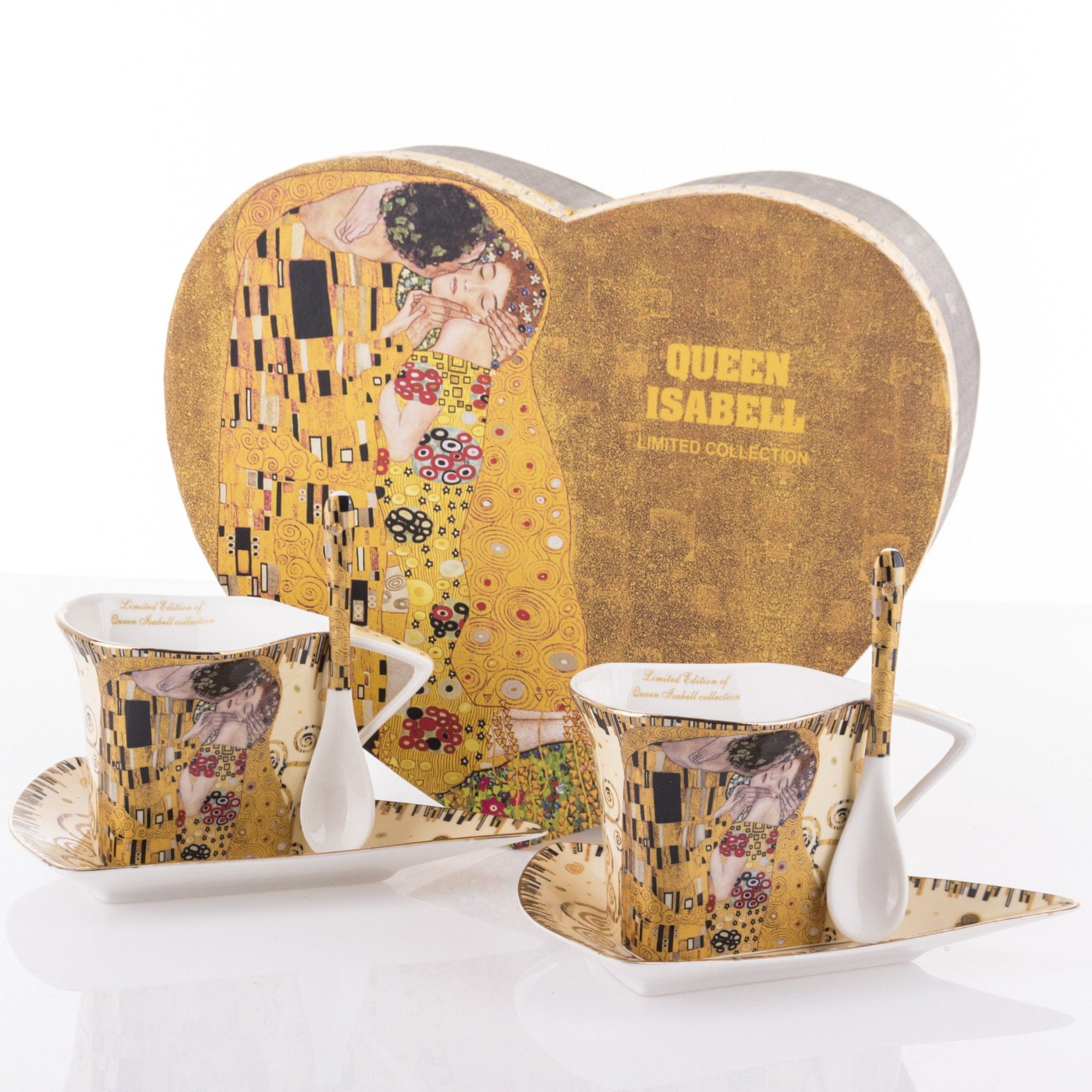 Dimenzija krožnik 2×15 , skodelica 9×18×13 cm, žlička dolžine 11,5 cm Dekor Gustav Klimt Poljub