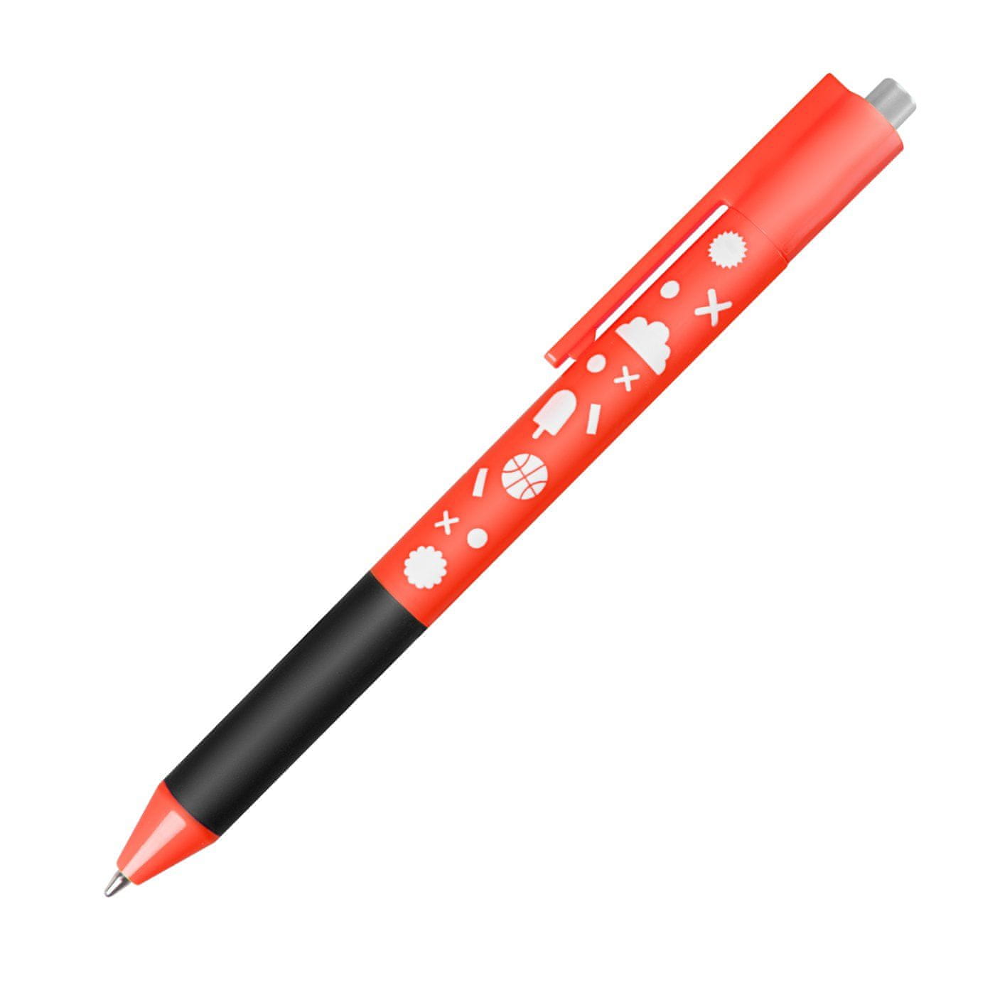 Kroglično pero ima priročen sistem za samodejno izmetavanje polnila. Samo enkrat kliknite, da izvržete ali umaknete kovinsko konico.