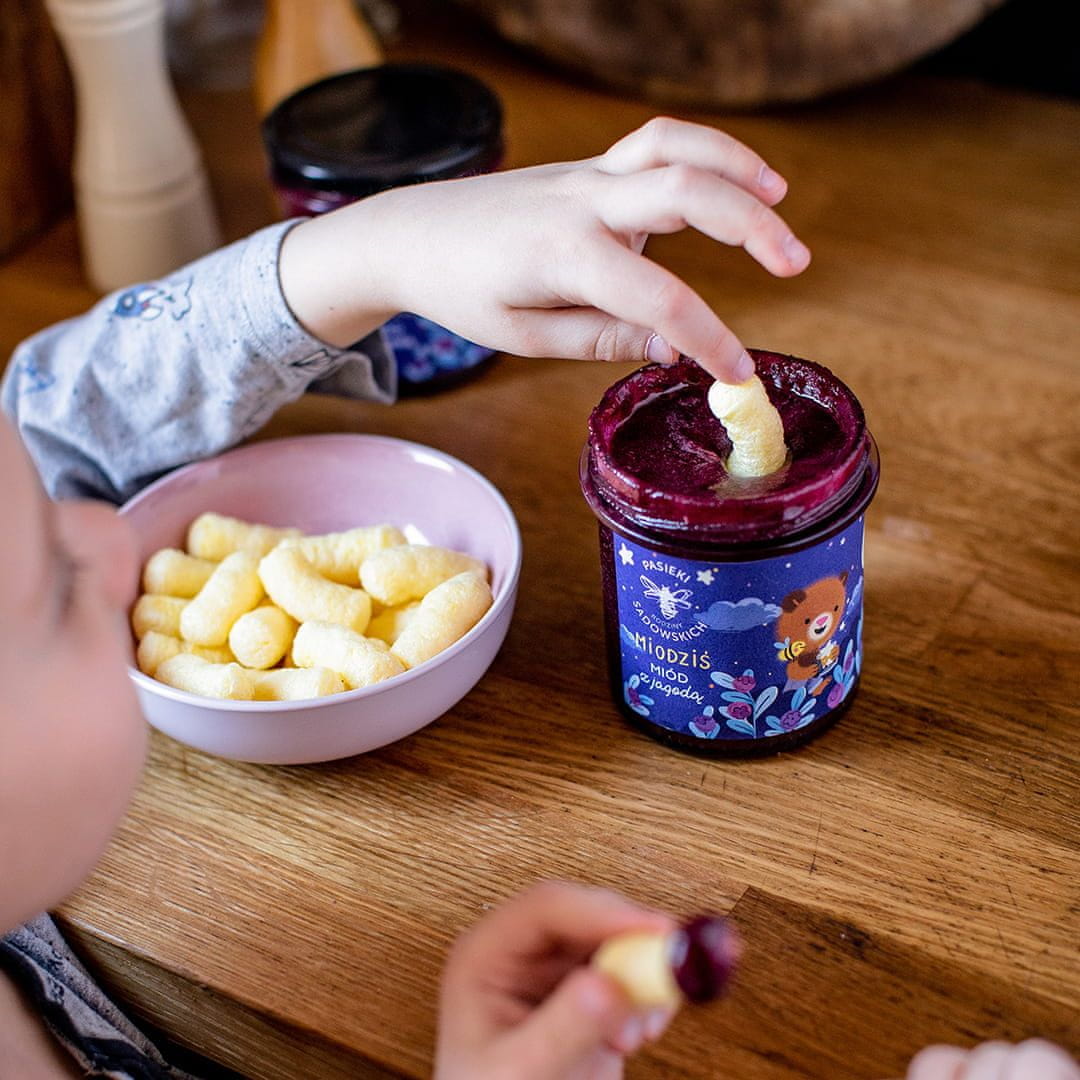 Spoznajte Miodziśa – zelo prisrčnega medvedka! Otroke ima rad kot nihče drug in jih uči ljubezni do narave, živali, predvsem pa jih okuži z ljubeznijo do medu, ki ga tako kot vsak pravljični medved zelo ljubi in ga kot nihče drug lahko pretihotapi tudi do najbolj izbirčnih jedcev. Tokrat vas Miodziś v spremstvu svoje prijazne čebele vabi na potovanje pod zvezdnatim nebom. Skupaj boste v mesečini iskali jagode na gozdni jasi in uživali v njihovem okusu v kombinaciji z okusnim večcvetličnim medom. In zvezde vam bodo uresničile vse sanje! Miodziś Med z borovnicami je 100 % naravna kombinacija večcvetličnega medu in liofiliziranih borovnic. Začinil bo sendviče, toast in sladkal vaflje. Popoln je za jutranjo ovseno kašo, palačinke in omlete. Za zajtrk, popoldanski čaj in večerjo. Z borovnicami Miodziś lahko pripravite tudi okusne limonade.