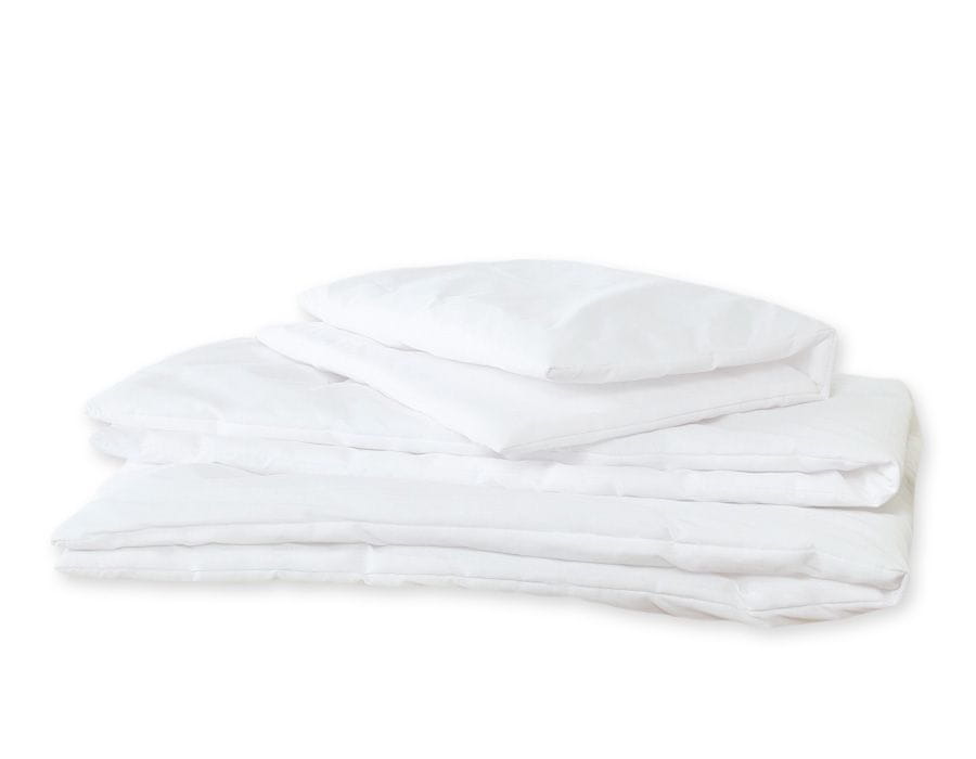 - Vzglavnik in odeja sta polnjena s certificiranim, mehkim in zračnim silikonom prevlečenim netkanim materialom, s posebno izbrano gramaturo, da vzglavnik ni predebel, hkrati pa zagotavlja optimalno mehkobo in elastičnost. Netkana tkanina ima certifikat Kotex, kar potrjuje njene hipoalergene lastnosti in varnost za otroke. Tkanina je izbrana tako, da zagotavlja najboljše toplotne parametre, brez nevarnosti pregrevanja otroka, hkrati pa je lahka in zračna;