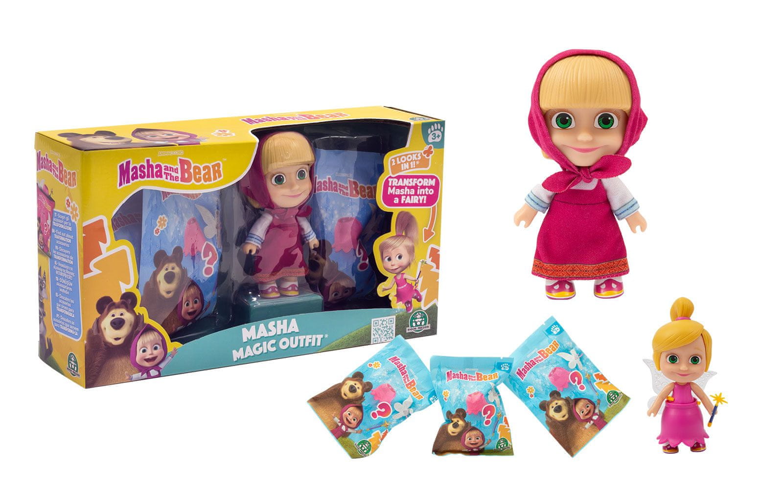 Mašina čudežna oblačila, Maša in Medved. Set vsebuje punčko Mašo, ki je velika 12 cm in ima odstranljive lase in obleko. V setu se nahajajo tudi 3 vrečke presenečenja in 4 različne dodatke za punčkino preobrazbo. Celoten opis