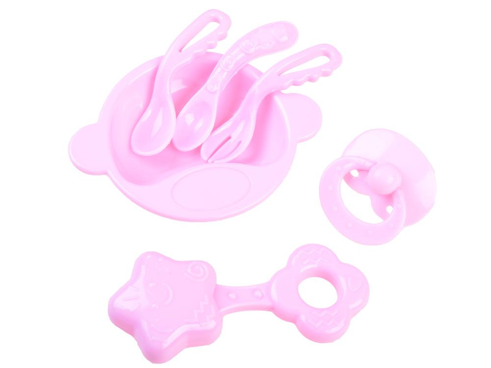 V kompletu so tudi dodatki za punčko, kot so skleda, žlice, vilice, lutka in ropotuljica, s katerimi bo igra prijetnejša in pestrejša. Lutka ima gibljive roke, noge in glavo ter zapre oči, ko jo položite na hrbet. Oblečena je v prikupne džins hlače in ljubko bluzo z modrim potiskom za dojenčke. Njeni kodrasti lasje, speti v dva konjska repka, ji dajejo še večji čar. Glava lutke je narejena iz trde gume, trupós ter roke in noge pa iz plastike. Tudi dodatki za roke so izdelani iz plastike. Pes je izdelan iz mehkega materiala.