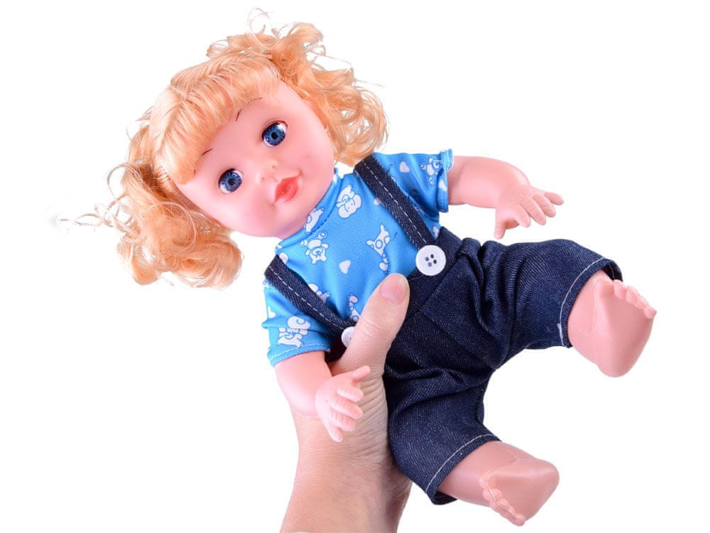 Razkošna lutka s plišastim psom in dodatki zagotovo bo razveselila vsako deklico. Ta čudovita lutka ima govorno funkcijo, saj ima v trebuščku vgrajen zvočnik. Govori besede v poljščini: mama, tata, smeje se, kašlja, kiha, joka, pošilja poljubčke itd. Da punčka ne bo žalostna, ji družbo dela mehak, belo-rjav plišast pes z rjavo ovratnico.