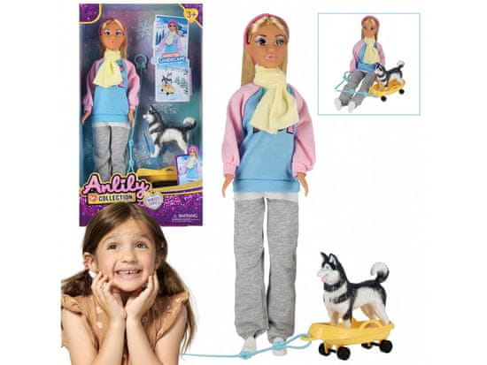Vsebina kompleta: lutka z oblačili, 1× figura psa Husky, 1× pasji voziček/sled.