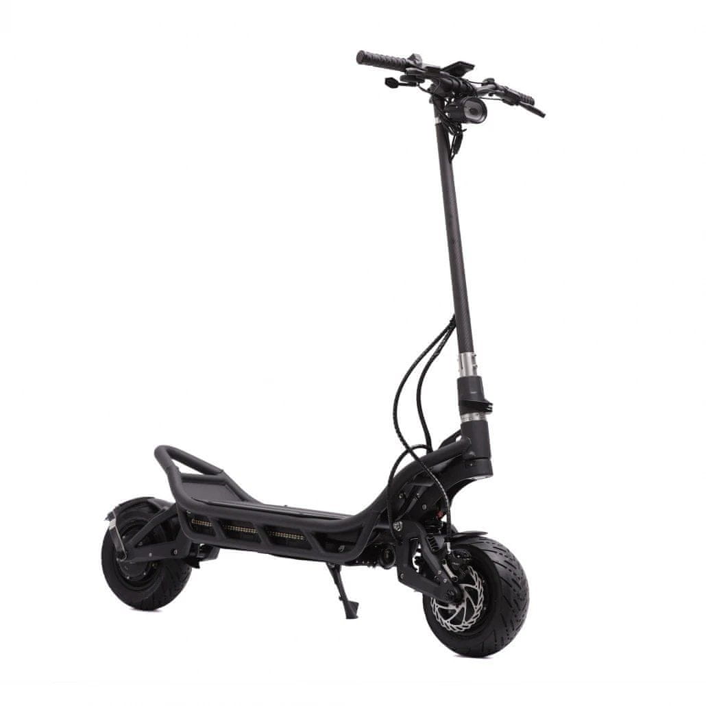 Krmilo in volanski drog sta narejena iz ogljikovih vlaken in imata premer 31,8 mm, kar zagotavlja trdnost in stabilnost med vožnjo. Površina za stojišče je velika in udobna, dimenzije so 564 mm x 312 mm, kar omogoča dovolj prostora za stabilno stojo med vožnjo. Celoten skiro, vključno z zložljivimi deli, je izdelan iz kakovostnih materialov, kot je nerjaveče jeklo 304, kar zagotavlja dolgo življenjsko dobo in odpornost na vremenske vplive. Skiro je opremljen tudi z standardnim cilindričnim blažilnikom krmila, ki omogoča stabilno in varno vožnjo tudi pri visokih hitrostih.