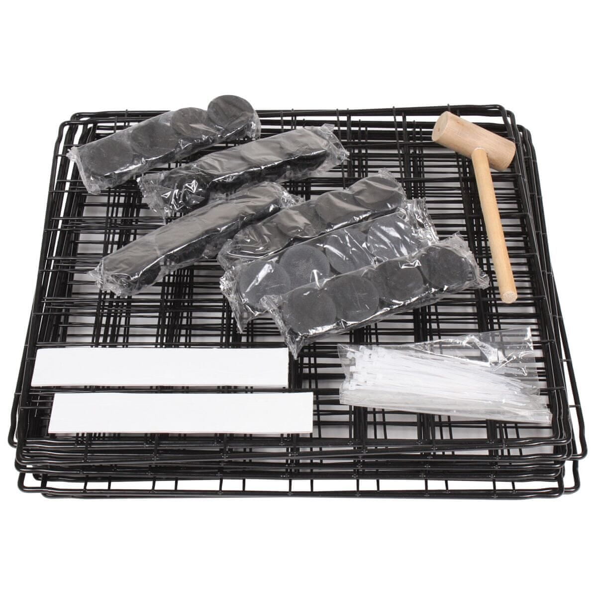 Merco Bucky playpen vašim manjšim hišnim ljubljenčkom, kot so kužki ali mucki, ponuja zaprt prostor, kjer se lahko igrajo in počivajo v miru, medtem ko jih vi nadzorujete. Ograja je zasnovana za notranjo uporabo in izdelana iz barvane jeklene žice, sestavlja pa jo skupno 12 mrežnih plošč, ki merijo 35 × 35 cm. S pomočjo plastičnih spojk lahko dele preprosto povežete in ogrado zmanjšate ali povečate glede na svoje želje in zahteve živali. Dolžina x širina x višina: 110 × 110 × 37 cm Opozorilo: ograja ni primerna za pse in mačke ter večje živali, ki bi lahko skočile ali se prevrnile čez ograjo. Sestavljanje ograje. Vsebina paketa: – 12 x panel rešetke, velikost: 35 × 35 cm (velikost enega očesa rešetke je 4 × 4 cm) – 24 x plastični konektor s premerom 3,5 cm – komplet lepljivih nedrsečih blazinic – komplet plastičnih zategovalnih trakov – 1 x leseno kladivo Material: – jeklena žica (posamezne plošče) – plastika (konektorji, zategovalni trakovi)