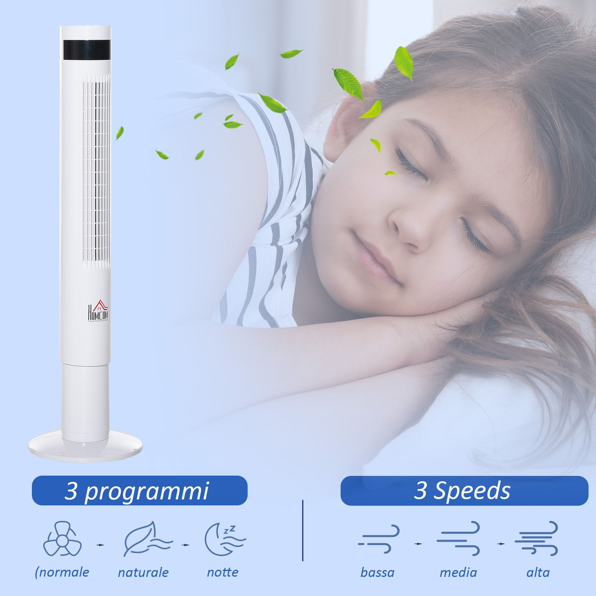 Vroče poletje? S tem stolpičnim ventilatorjem HOMCOM preživite dneve v hladu. Odličen je za dom ali pisarno, saj ima 3 programe, 3 hitrosti in oscilacijsko funkcijo za enakomerno porazdelitev hladnega zraka. Uporaba je zelo preprosta, saj lahko časovnike in funkcije nastavite neposredno na zaslonu LED na ventilatorju ali s priročnim daljinskim upravljalnikom, ki je priložen.Vsebine: