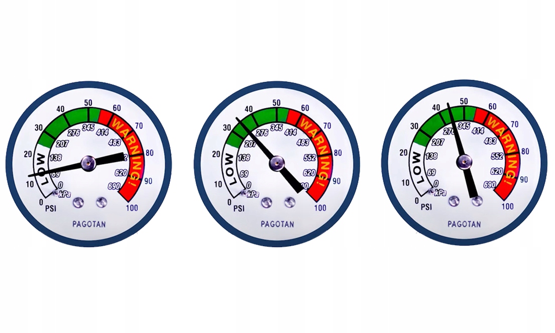– območje 0–25 PSI : prenizek tlak v sistemu. Dodati je treba hladilno sredstvo. Barva ZELENA