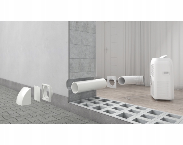 Komplet je zasnovan za večino prenosnih klimatskih naprav, pri katerih premer odprtine za izpustno cev ne presega 13 cm.