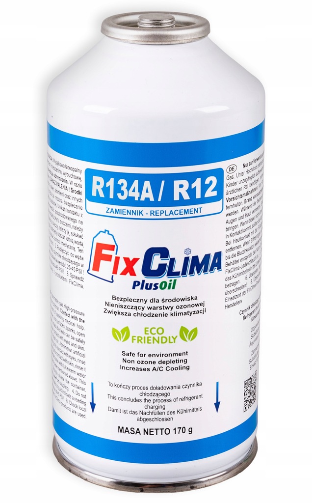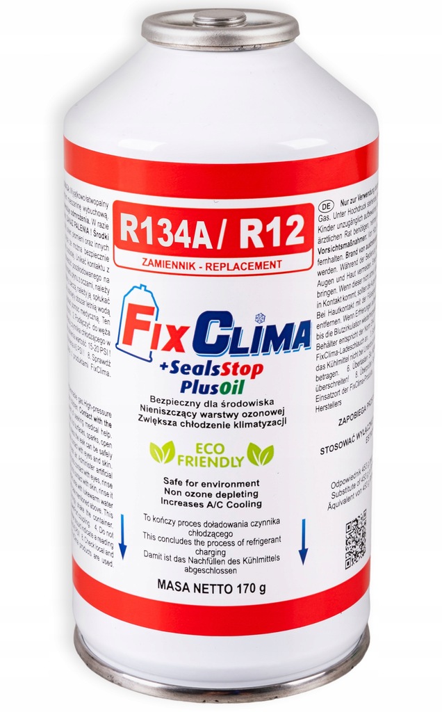 Ena pločevinka vsebuje 170 gramov hladilnega sredstva FixClima , kar ustreza 453 gramom prejšnjega hladilnega sredstva R134a .