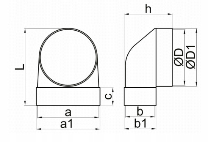 90° navpično koleno za priključitev ravnih kanalov na okrogle kanale. Enostavna montaža brez specializiranega orodja, „vtisni“ , ne potrebuje veziva, npr. lepila, lahka konstrukcija, estetski videz.