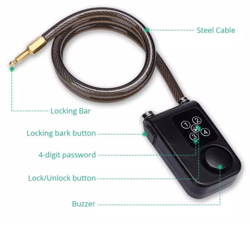 Ta kombinacijska ključavnica z alarmom poskrbi za dvojno varnost – z močno žično zanko in občutljivim senzorjem, ki ob poskusu kraje sproži glasen 110 dB alarm.