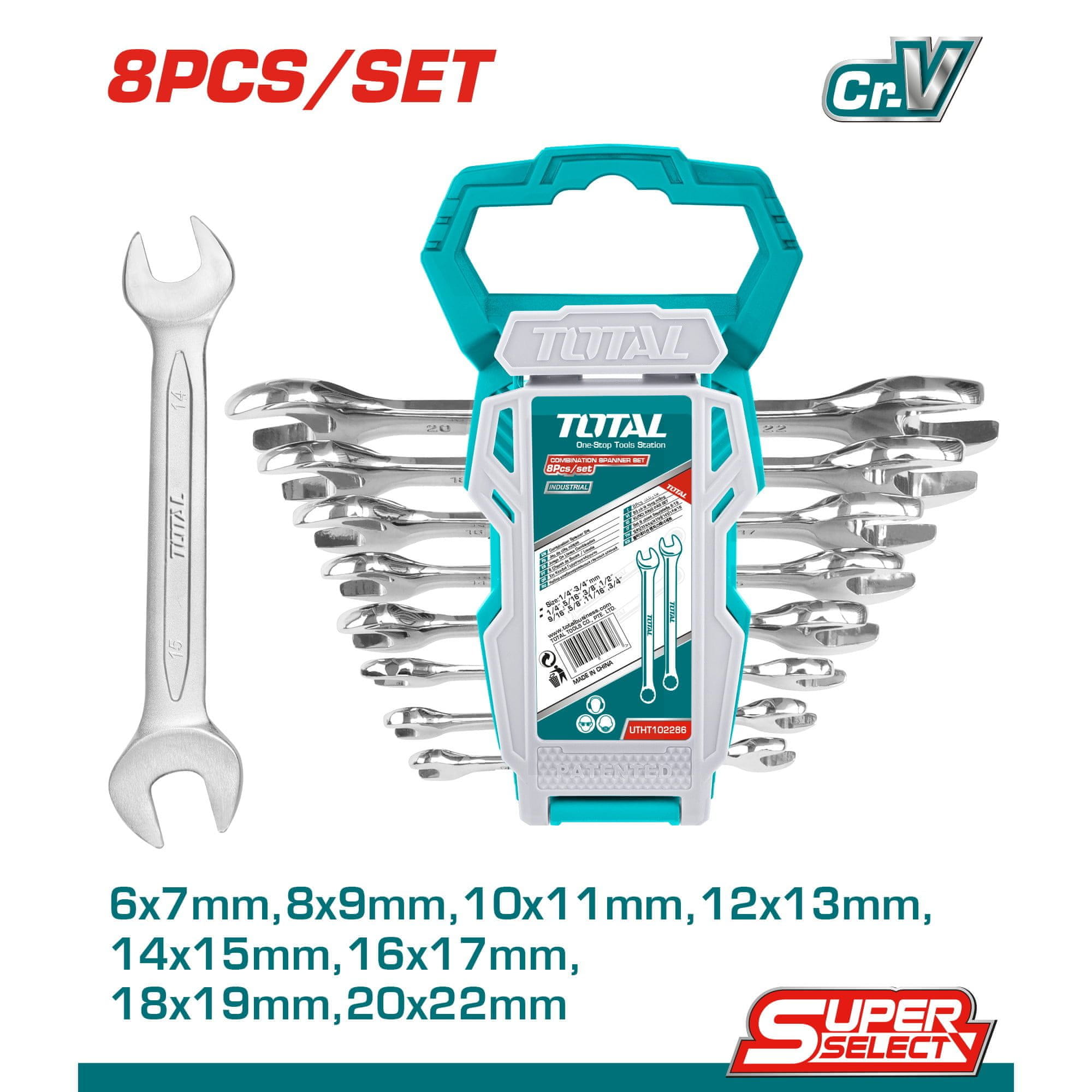 8-delni set ključev 386 / IND****. 8-delni set ključev Velikost: 6-22 mm 6×7mm, 8×9mm, 10×11mm, 12×13mm, 14×15mm, 16×17mm, 18×19mm, 20×222mm Fino polirano Pakiran s plastičnim obešalnikom Nabor kombiniranih ključev TOTAL THT102386 (Industrijska serija) vključuje 8 profesionalnih zatičnih oro Celoten opis