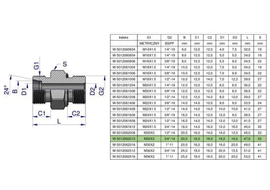 Hidravlični priključek (težki tip XGE) BB M30×2 20S x 3/4"" BSP ED Waryński (naprodaj v kompletih po 2) Celoten opis