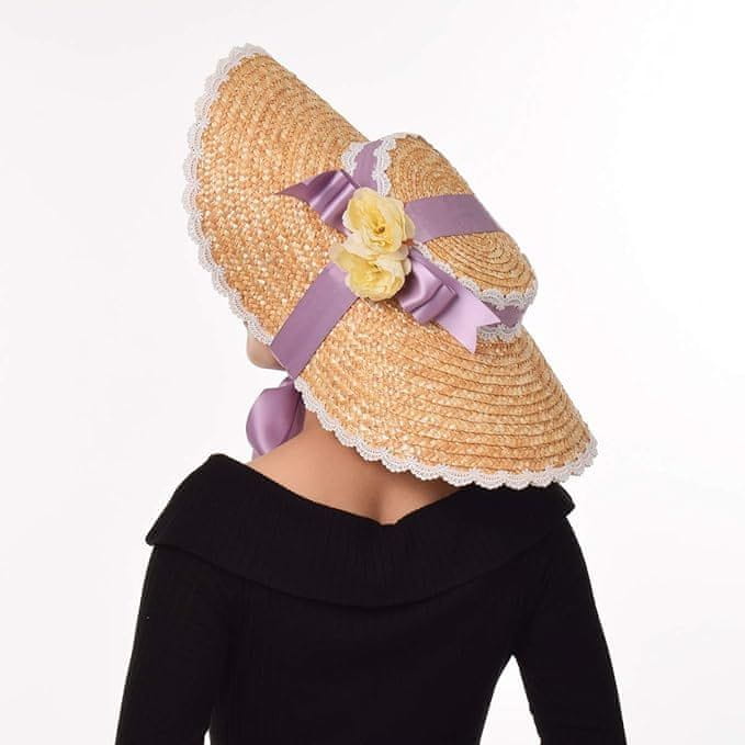 Nikcorp Viktorijanski slamnik s cvetjem in vijoličnimi trakovi | Poletni klobuk za na plažo in cosplay | Obseg 56 cm