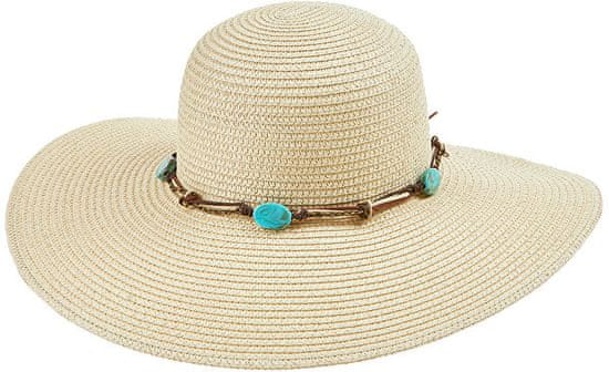 Lahek in zračen ženski klobuk v bež barvi. Širok rob zagotavlja zaščito pred soncem in eleganten videz. Celoten opis