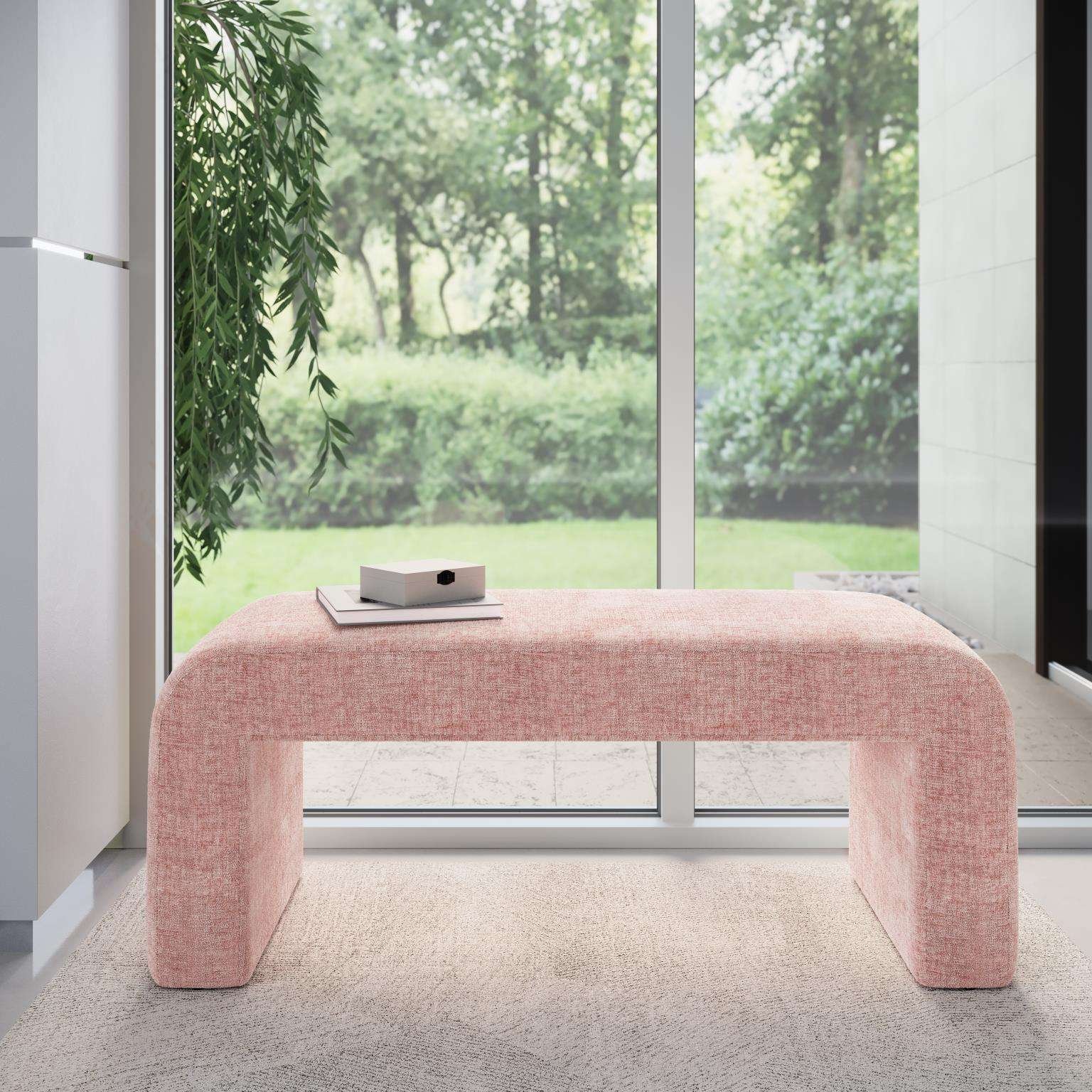 Elegantno oblazinjena v svetlo rožnatem žakardnem blagu ta klop predstavlja prefinjeno dopolnitev vsake dnevne sobe spalnice ali hodnika. Njena preprosta odprta zasnova omogoča vsestransko sedenje in hkrati poudari dekor vašega prostora. Izdelana iz visokokakovostnih materialov združuje udobje z modernim videzom.