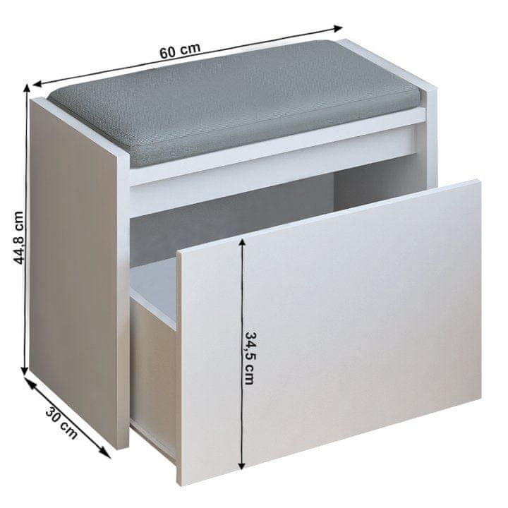 Poživite svoje prostore v hiši s klopjo za shranjevanje BERGI. Dimenzije klopi so (ŠxGxV): 60×30×44,8 cm. Klop je elegantna, zanesljiva in bo postala pomočnik pri vzpostavljanju reda v domu. Poleg tega je udobno sedenje in med drugim ponuja prostor za shranjevanje. Izdelana je iz laminirane DTD (iverne plošče) v beli barvi. Klop vsebuje en predal, v katerega lahko shranite vse, kar potrebujete.