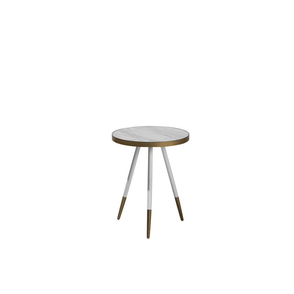 Elegantna miza za shranjevanje na treh nogah. Površina mize posnema marmor. Belo barvo mize dopolnjuje zlata barva na koncih nog in zgornjem obroču. Višina mize je 55 cm, premer zgornjega dela je 44 cm.