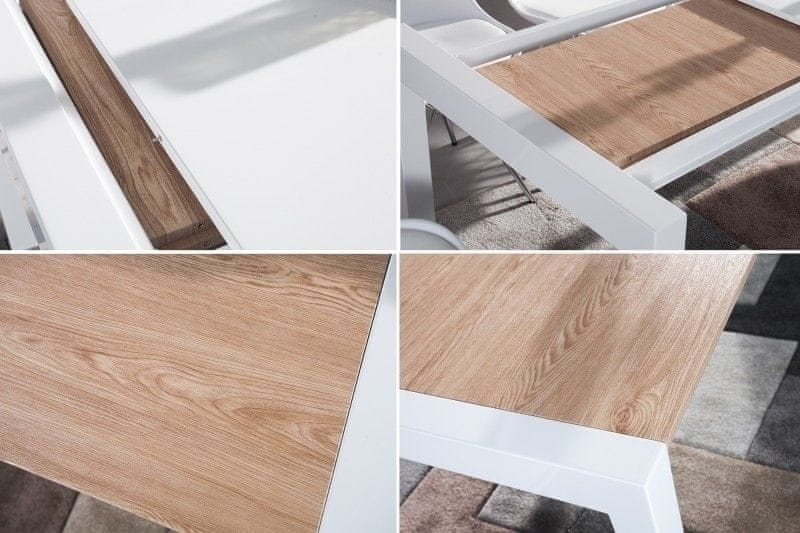 CASPER je zložljiva miza, ki bo delovala kot funkcionalna in estetska osrednja točka jedilnice. Izdelana je iz bele plošče MDF z visokim sijajem, zaradi česar je videti privlačno – moderno in elegantno. Dobro se bo prilegal tako preprostim stolom kot elegantnim oblazinjenim modelom. . S pomočjo dveh priloženih vložkov ga je mogoče po potrebi razviti. Osnovna dolžina mize je 135 cm, možno jo je podaljšati na 175 ali 215 cm. Ta možnost je praktična in bo zadovoljila ljudi, ki cenijo čas z veliko skupino prijateljev ali z družino. Skupna višina: 75 Širina: 135–175–215 Globina: 80