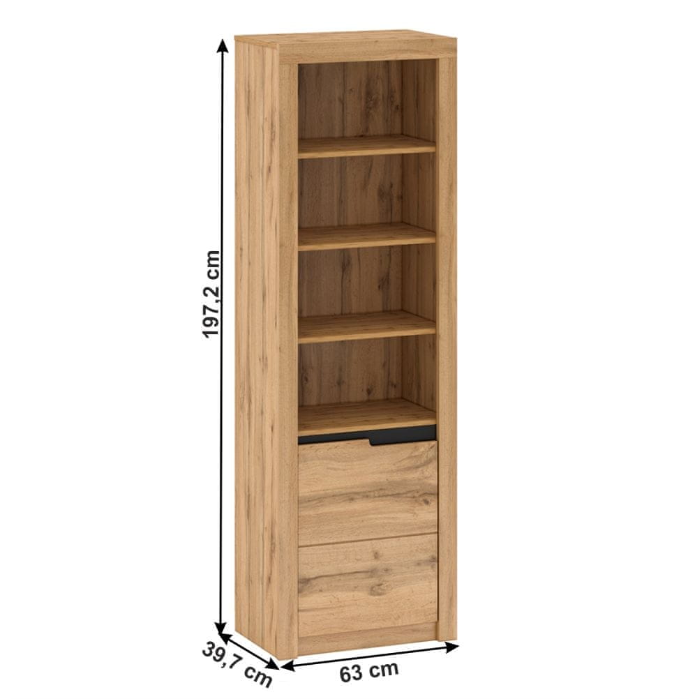 Polica TORONTA R1 L v levi različici lahko s svojo prisotnostjo razveseli tudi vašo notranjost. Ponuja veliko prostora za shranjevanje v obliki odprtih polic in omare. Dimenzije regala so (ŠxGxV): 63×39,7×197,2 cm. Debelina materiala na korpusu je 16 mm, na vratih 19 mm. Sektorsko pohištvo TORONTA ne odlikuje samo izviren in privlačen dizajn, temveč tudi funkcionalna in uporabna plat. Primerno za opremo jedilnice ali dnevne sobe. Za njegovo izdelavo je bila uporabljena laminirana DTD (iverna plošča), vrata so iz foliranega MDF (vlaknena plošča). Postal bo prevladujoč v notranjosti. Izpopolnjena je tudi s čudovito barvno različico hrasta wotan, ki bo poskrbela za prijetno vsako gospodinjstvo. Pohištvo se dostavi razstavljeno. Varen slog in udobje hkrati s sektorjem Toronto.