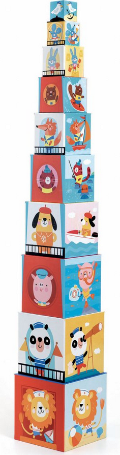 Priljubljeni stolp v škatli v novi preobleki, Happy Animals on the Beach (Srečne živali na plaži). Srečne živali na plaži. Otroci uživajo v gradnji kock in njihovem rušenju. Ali pa jih nasprotno sestavljajo skupaj. Učijo se fine motorike, postopoma prepoznavajo osnovne barve, oblike, številke, kontinuiteto slik. Paket vsebuje: 10 kock Višina zgrajenega stolpa: 89 cm