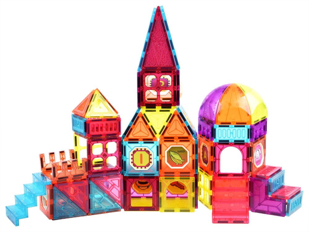 Magnetne plošče 111 elementovónamenjene gradnji prostorskih struktur in učenju angleščine. Vsakemu otroku bodo zagotovili veliko zabave in ustvarjalno preživetega časa. Pisane opeke iz prosojne plastike fantastičnih barv, dodatno okrašene z vzorci, omogočajo gradnjo vseh prostorskih objektov: hiše, palače, avtomobila, sladoledarne. Poleg tega so za večjo privlačnost kompleta na voljo nalepke, ki jih bo otrok lahko sam nalepil po lastnih zamislih.
