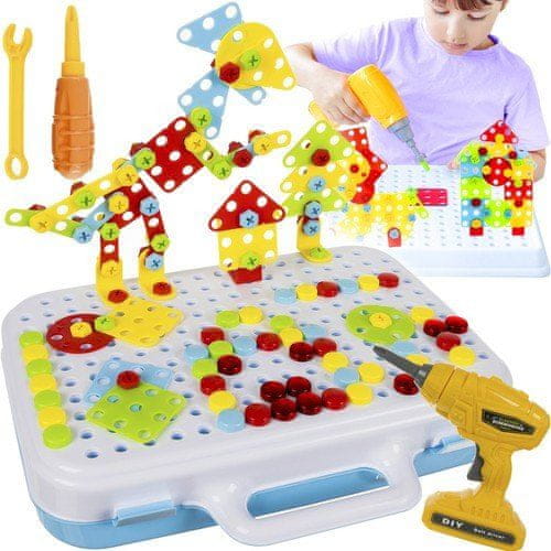 Igrajte se z mozaiki za razvoj ročnih spretnosti, koordinacije oko-roka in logičnega mišljenja. Otroci bodo vadili potrpežljivost ter koncentracijo, kar je odličen način za kreativno in zabavno druženje s starši. Igra vključuje razporejanje slik in vzorcev z uporabo številnih oblik, kot so pravokotnik, kvadrat, krog in trikotnik. Izbrane elemente privijte z izvijačem na dno kovčka, ki ima posebne luknje za stabilno postavitev.