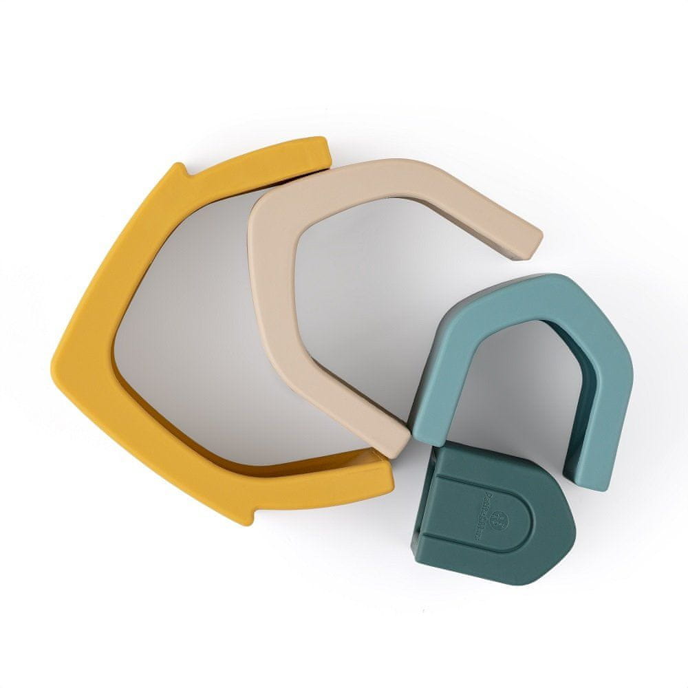 Mehki silikonski elementi so izdelani izključno iz živilskega silikona, ki ne vsebuje BPA. Najkakovostnejši, trpežni materiali, pozornost do podrobnosti in skrbno izbrane velikosti lokov otroku omogočajo varno igro in spodbujajo njegov razvoj.