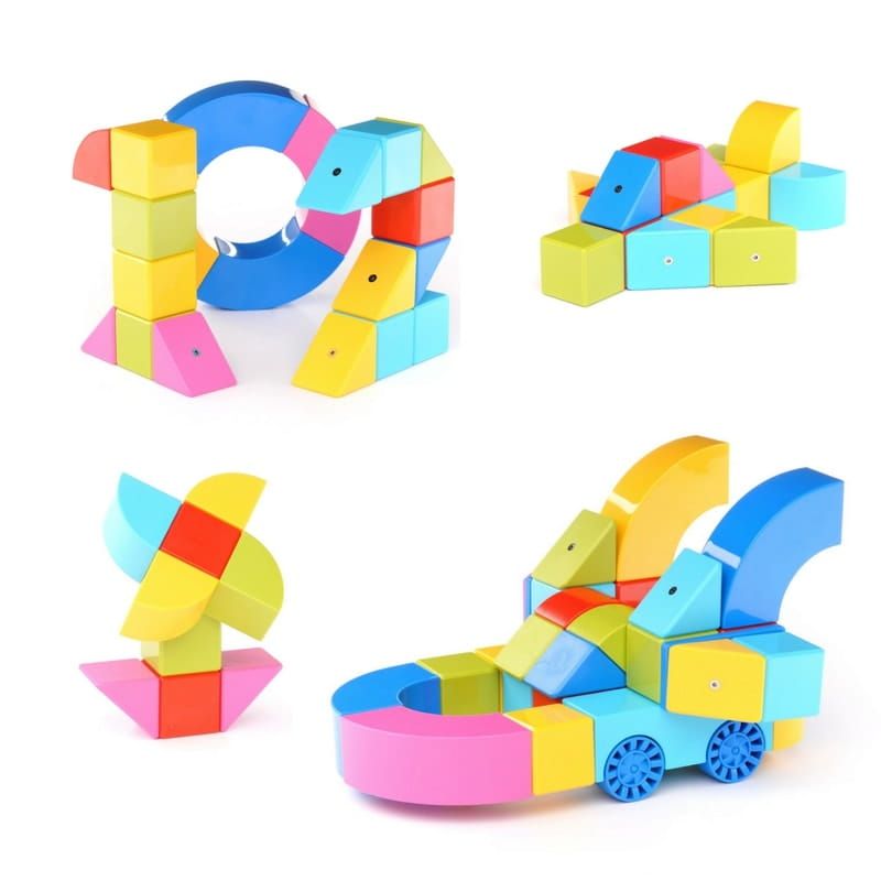 • 6 različnih oblik kock (vključno s kockami, loki, ploščicami, elementi s premičnimi kolesi) – omogoča ustvarjanje ravnih in tridimenzionalnih figur ter sestavljanje črk abecede in številk