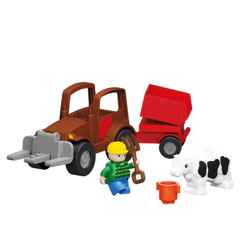 Komplet kock Kmetija za malčke iz serije Velike dogodivščine je namenjen otrokom od 2 leta starosti Komplet vsebuje 11 kosov, vključno s traktorjem s prikolico, lopato, vedrom, ljubko lisasto kravo in figuro kmeta Arthurja Velikost kock zagotavlja enostavno zlaganje in varno igro za malčke