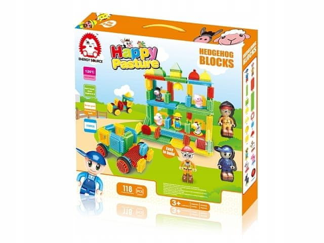 Komplet s 118 kockami ježek – HAPPY FARM vključuje ne le edinstvene kocke, temveč tudi figure živali in kmeta.