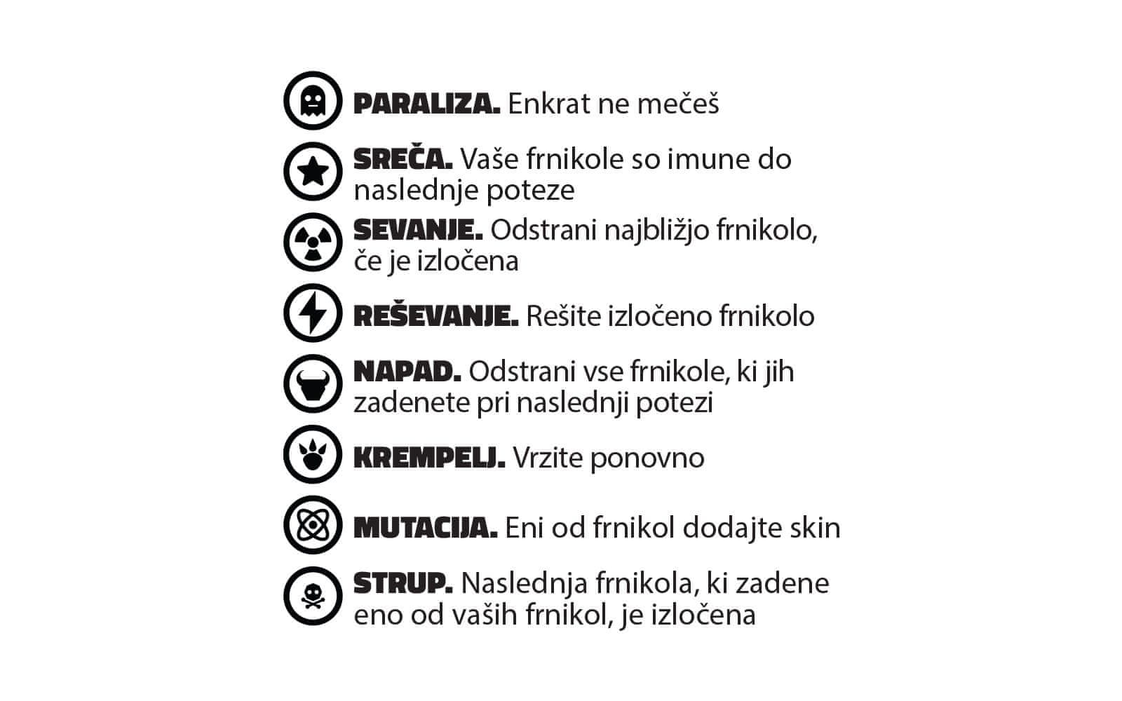 Vrečka vsebuje 1 frnikolo Freak Marbles, katero dobite pa je presenečenje. Frnikola ima tudi preobleko, s katero reprezentira lik. Spoznajte vse like – zberete lahko 25 likov/karakterjev, med njimi so tudi 4 redki.Igra s frnikolami pomeni cilj premagati nasprotnikove frnikole tako, da jih izločite in tako dosežete najvišje število točk na bojišču. Vsaka frnikola ima na hrbtni strani simbol, ki ponazarja njegovo moč.