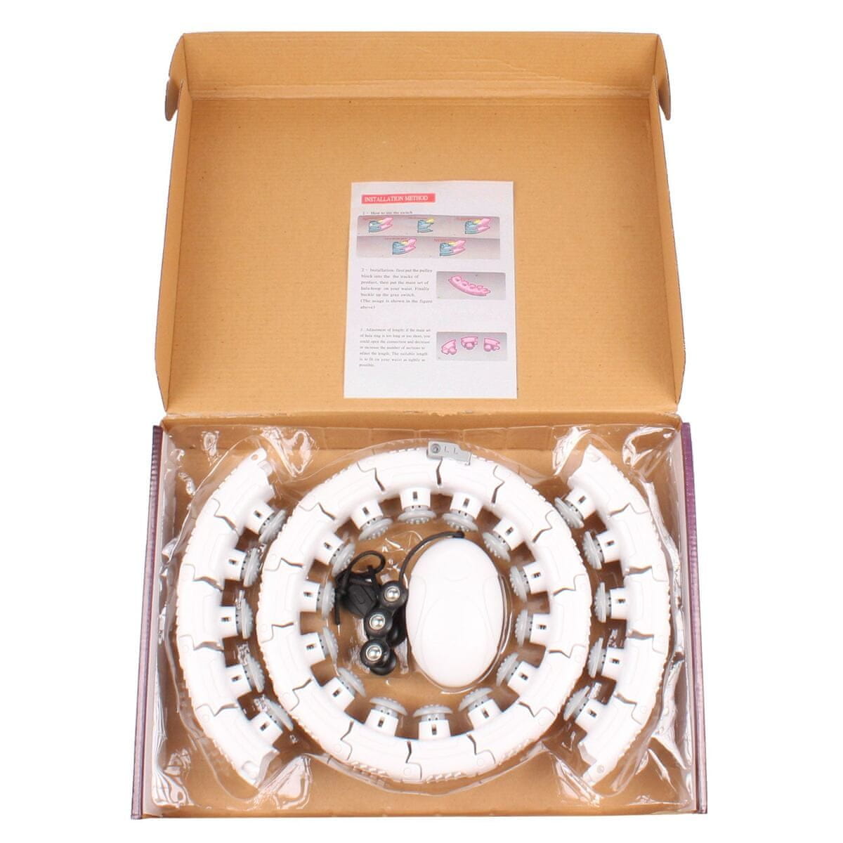 Krčenje trebuha z obročem je ena najučinkovitejših preizkušenih vaj za oblikovanje pasu in trebuha, s katero se boste hitro znebili odvečne maščobe in pokurili odvečne kalorije. Z masažo z obročem Hula Hoop je ta vaja še bolj učinkovita in zabavna, obvlada pa jo lahko tudi popoln začetnik. Za razliko od običajnih obročev ta obroč ne drsi in se zaradi svoje prilagodljivosti prilagodi vsaki obliki telesa. Izdelan je iz močne plastike ABS in deluje po načelu uteži, ki je z vrvico znotraj strukture obroča pritrjena na drsnik, ki ga s krožnim gibanjem medenice spravite v gibanje okoli telesa. Obroč je sestavljen iz 24 ločenih snemljivih členov, s pomočjo katerih je prilagoditev želenega obsega pasu vprašanje nekaj sekund. Največji obseg pasu je mogoče prilagoditi do 110 cm. Nastavljiva je tudi dolžina vrvice z utežmi, in sicer od 20 do 35 cm. Notranji del obroča sestavljajo masažni izrastki z vzmetmi, ki med vrtenjem uteži masirajo telo in delujejo tudi kot blažilci pritiska. Za čim večji učinek vadbe priporočamo, da kroženje z utežmi izvajate vsaj 30 minut. Masažni obroč Hula Hoop je odličen in vsestranski fitnes pripomoček, primeren za vso družino. Parametri. 8 × 12 × 4 cm – dolžina vrvice z utežmi min/max: 20 – 35 cm Material.
