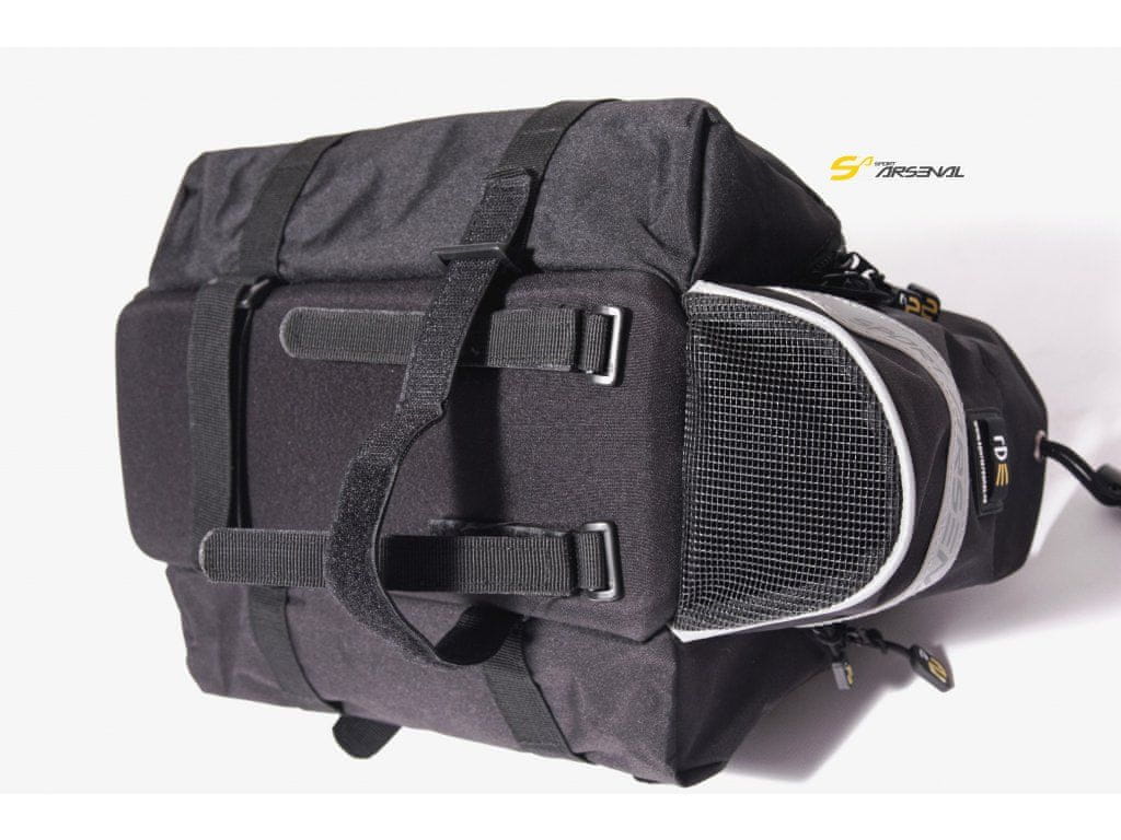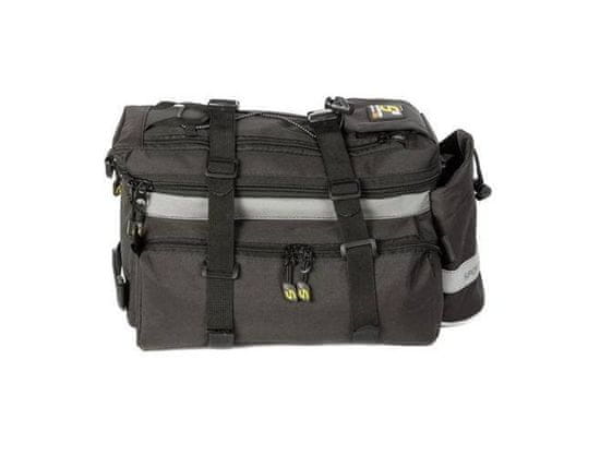 Večnamenska torba 450 za zadnji ali sprednji nosilec z možnostjo povečanja prostornine torbe – če odprete zgornjo zadrgo. Torba s prostornino 40 × 25 × 19–29 cm in prostornino 12 litrov ima en velik notranji žep, dva zunanja stranska žepa z zadrgo in dva manjša žepa za praktično porazdelitev tovora. Pritrditev torbe na zgornji nosilec je preprosta s tremi zaponkami na velcro. Zategnite dva kompresijska trakova, da pritrdite tovor, ki ga prevažate. Ko je torba ločena, jo lahko zaradi naramnega pasu udobno nosite. Torba 450 je izdelana iz visokokakovostnega vodoodpornega (ne vodoodpornega) materiala, ima trdno lupinsko dno, zato odlično drži obliko in je stabilna. Torbi je priložen tudi pokrov za zaščito pred umazanijo in manjšo vlago (ni vodoodporen, ne služi kot dežni plašč). Na torbi so všiti varnostni odsevni elementi za boljšo vidljivost. S praktično torbico 450 Pannier boste na potovanju s kolesom uživali v udobju in priročnosti. Parametri.