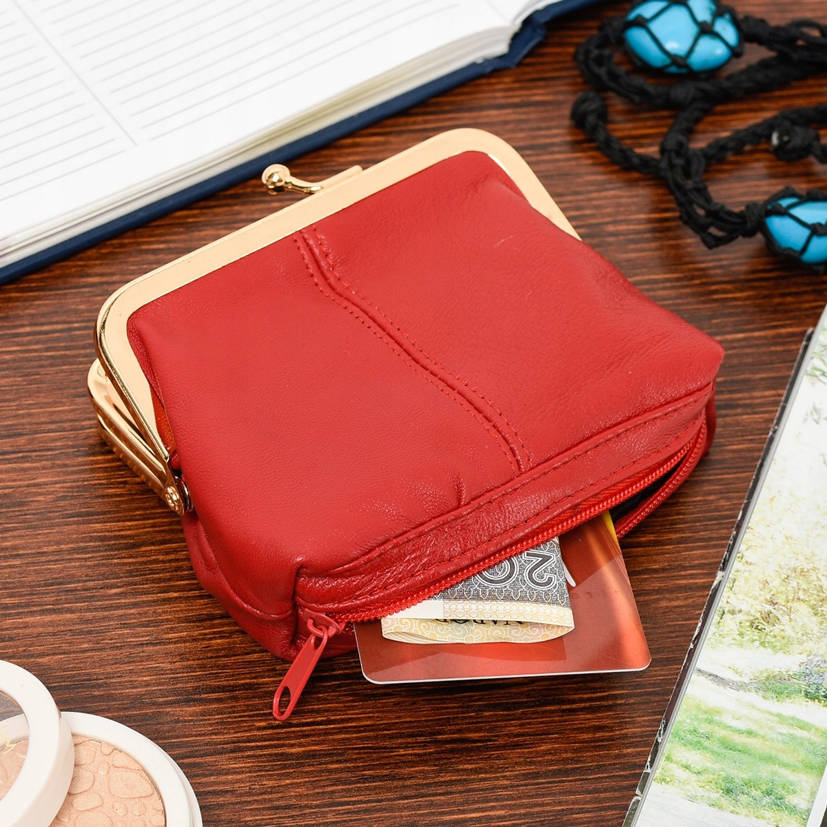 Čudovita denarnica, žep za kovance na zaponko, kljub majhnosti prostorna, izdelana iz naravnega usnja.