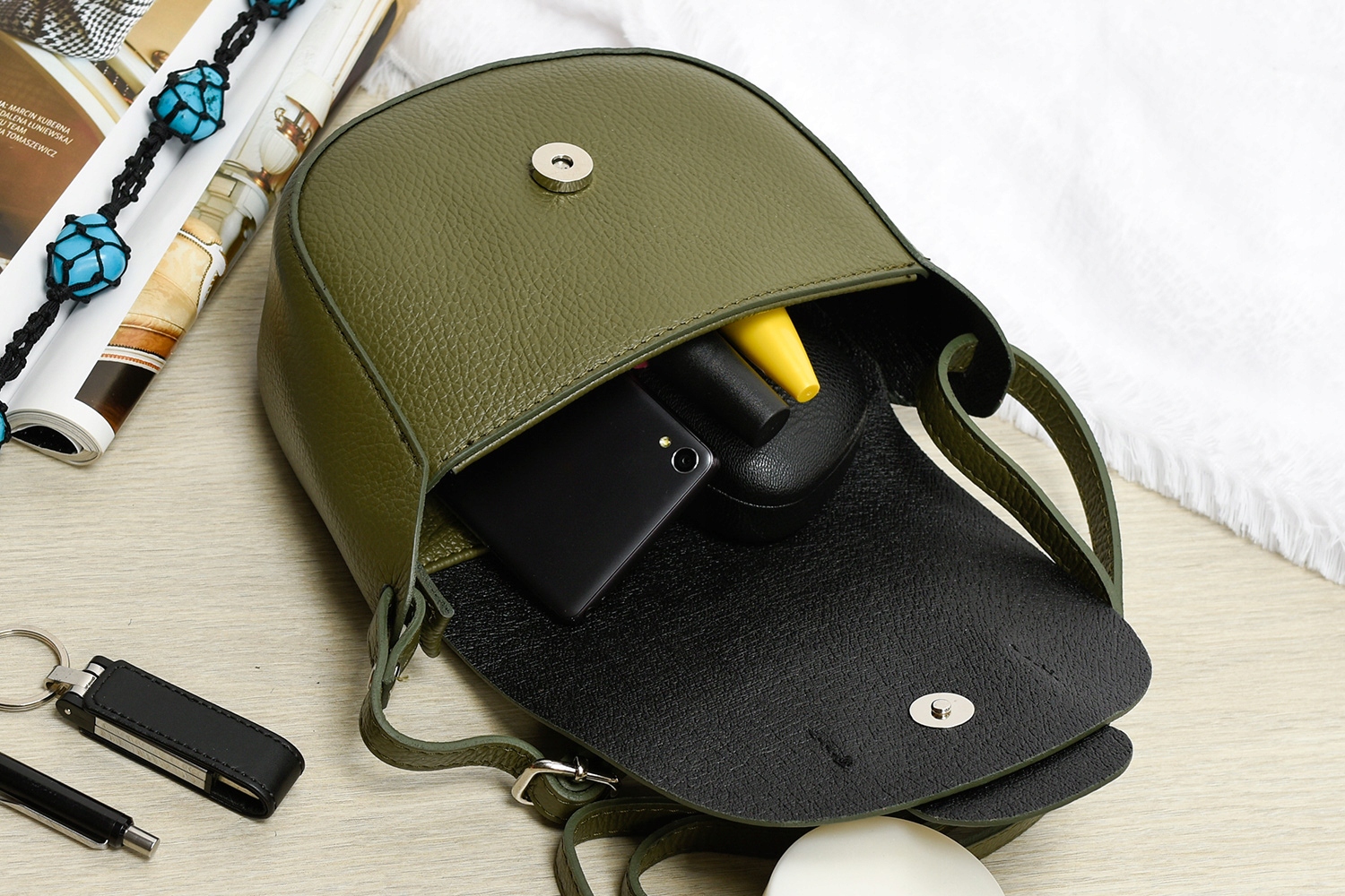 Predstavljena torbica je v olivni barvi.