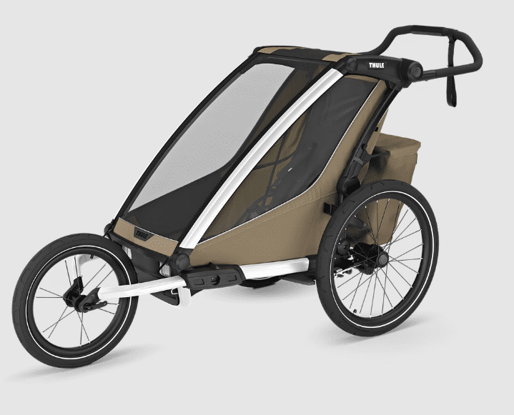 Oblikovana tako, da se lahko uporablja med kolesarjenjem, tekom, sprehodom ali smučanjem (kompleti za tek in smučanje so naprodaj ločeno). Priložena dežna prevleka in sončna streha pa ohranjata vašega otroka suhega in ga ščitita pred soncem.