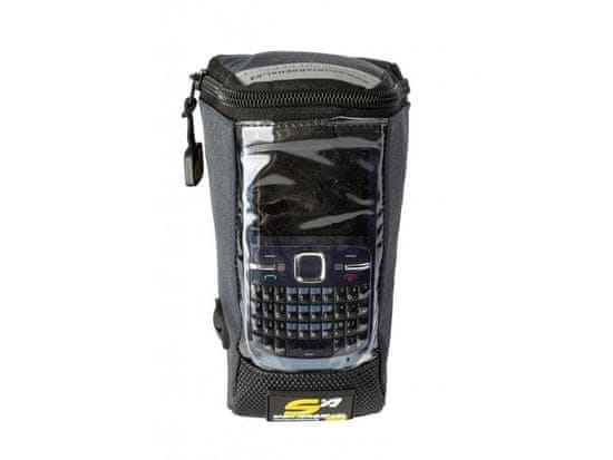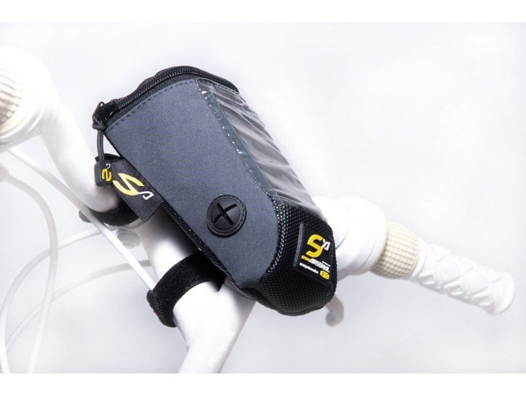 Majhna torbica za krmilo iz vodoodpornega materiala, 15 × 9 × 6 cm, z žepom za MP3 ali klasični manjši mobilni telefon. Celoten opis