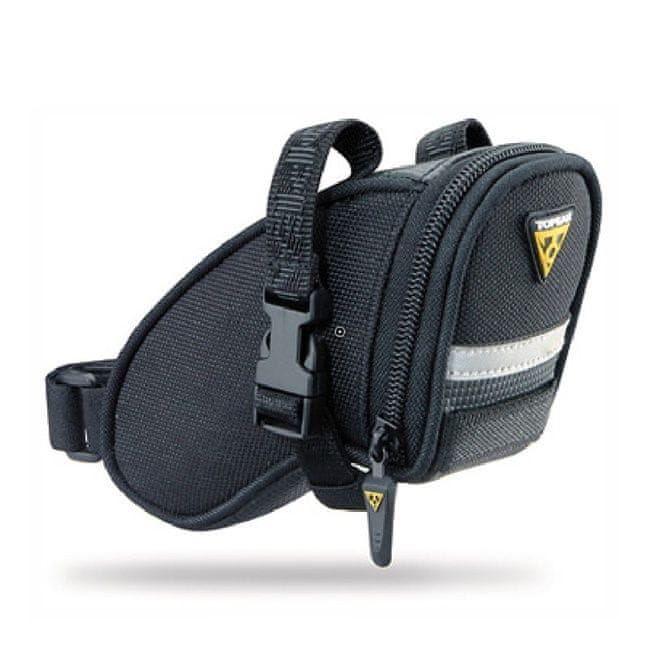 Aerodinamična sedalna torba Topeak s tradicionalno obliko in zapenjanjem s trakom. Torbico za sedlo TOPEAK AERO WEDGE uporablja tudi profesionalna ekipa MTB Topeak Ergon na dirkah.