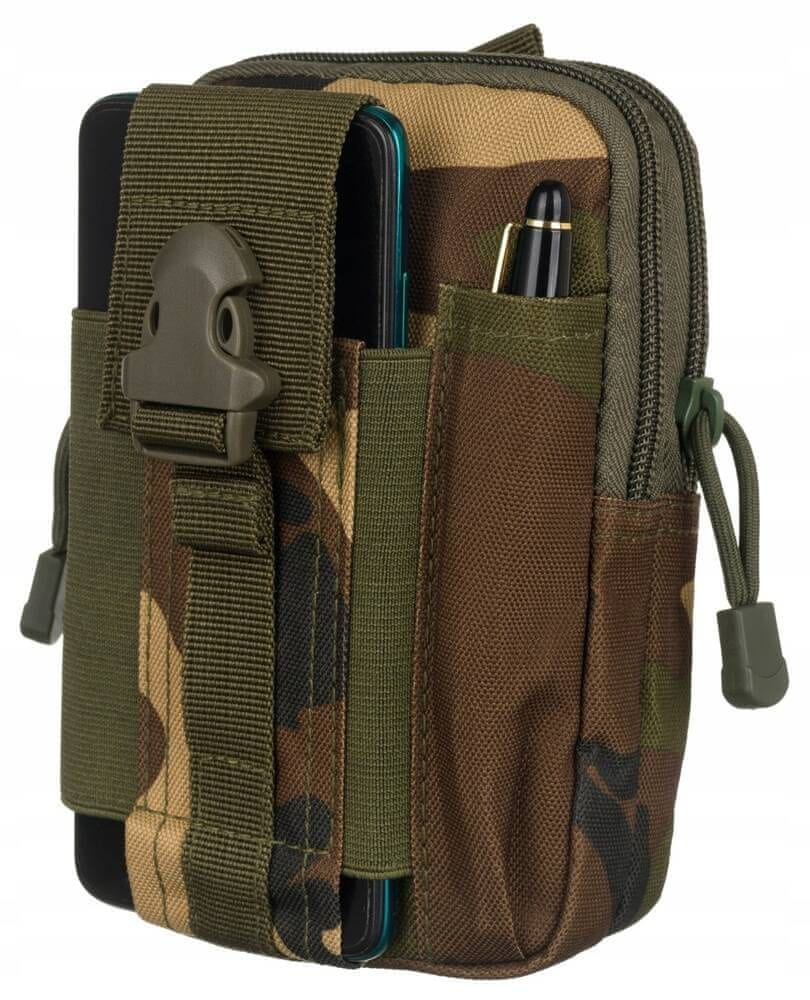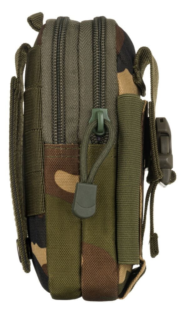 Opremljen z MOLLE-združljivim trakom     sistemom     ki se nahaja na hrbtni strani torbice in omogoča pritrditev na pas ali taktični nahrbtnik kot dodatno opremo.