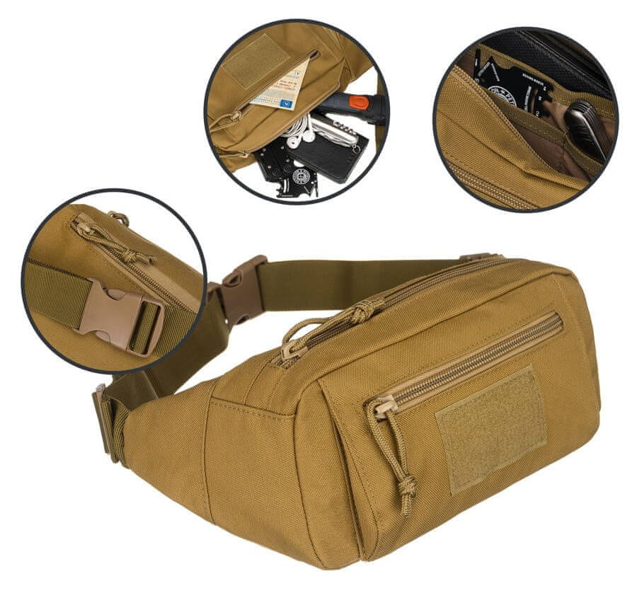 Športna     torbica za okoli pasu z enim predelkom     vojaški slog     s tremi odprtimi žepi v notranjosti. Poleg tega ima en žep na hrbtni strani in enega spredaj.     Popolna za vsakodnevno uporabo, telesno aktivnost ali srečanje s prijatelji.