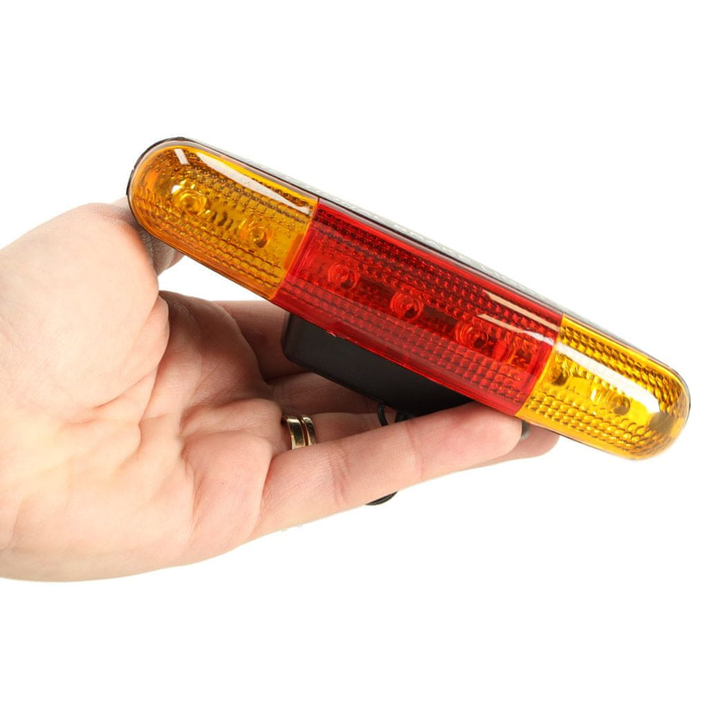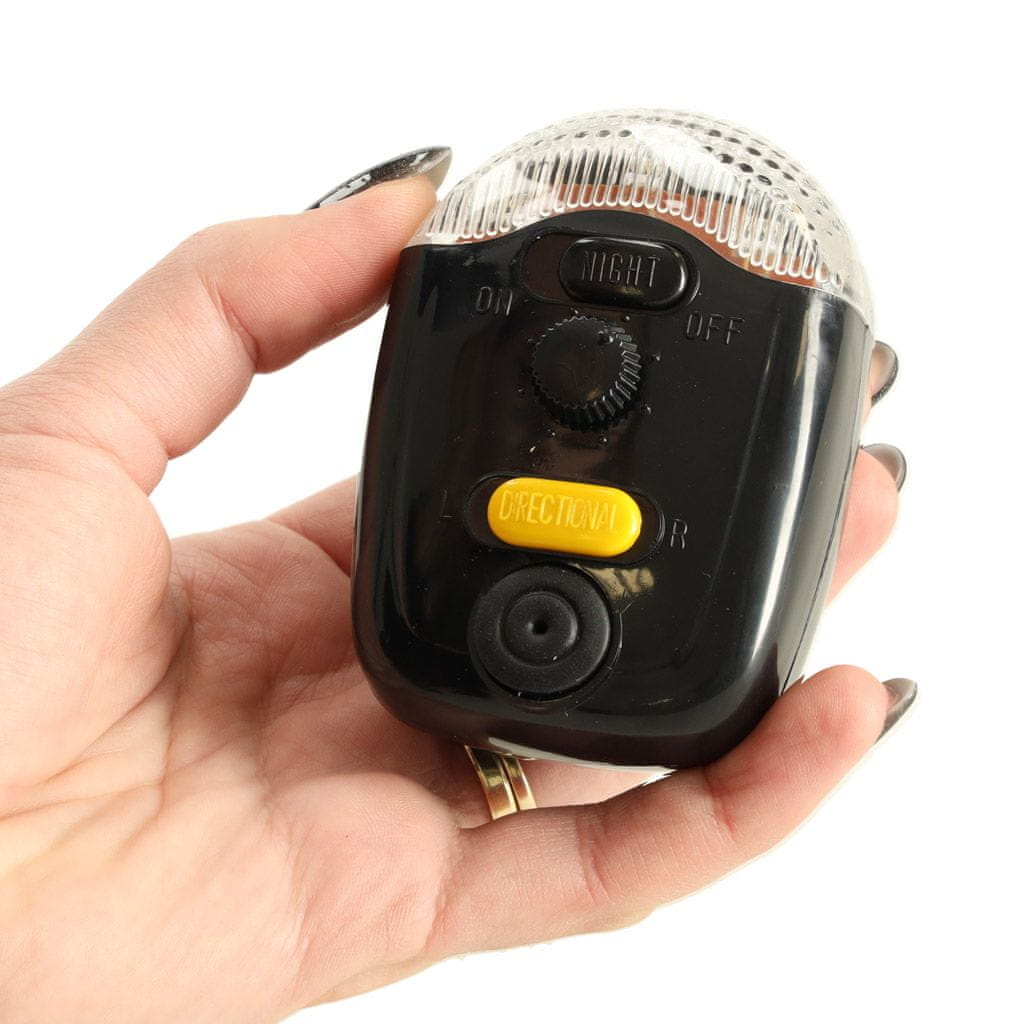LUČI ZA KOLO S SMEROKAZI – SET Komplet luči s smerniki. Poskrbeli bodo za varnost v cestnem prometu pri vožnji s kolesom. Luči imajo 2 načina delovanja: – noč – dan Nočni način: prižge sprednje in zadnje luči. Svetilka ima tudi funkcijo hupe. Ob pritisku se iz zvočnika v žarometu zasliši zvok. Vrtljivi gumb preklaplja med različnimi zvoki hupe. Gumb za hupo ima 8 različnih zvokov. Drsnik lahko postavite v tri položaje: levo, sredinsko in desno. Ko je na sredini, je funkcija izklopljena. Če se premikate v eno smer, se vklopi smernik (na obeh straneh rdeče zadnje luči). Hitra in enostavna namestitev Navodila za montažo Bela sprednja luč je nameščena na krmilu kolesa, zadnja luč pa na okvirju pod sedežem. To naredimo s pomočjo priloženih sponk. Objemko 1 pritrdite na sprednjo luč od spodaj z vijakom, objemko 2 pa vstavite v vodilo na zadnji strani zadnje luči, tako da se zapah prilega vdolbini. Stikalo zavorne luči pritrdimo na zavorni kabel, poleg kovinskega štrline na okvirju, tako da stikalo klikne ob vsakem pritisku na zavoro. Komplet vsebuje: Pilot zavorno luč Smernik Set montažnih elementov Napajanje: 2× AA baterije (niso priložene). Mere: Indikator: 13 cm x 3,5 cm Pilotska zavorna luč 8 cm x 5 cm Opomba: Sprednja luč je rdeča