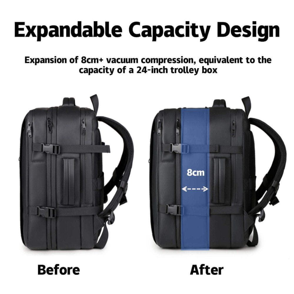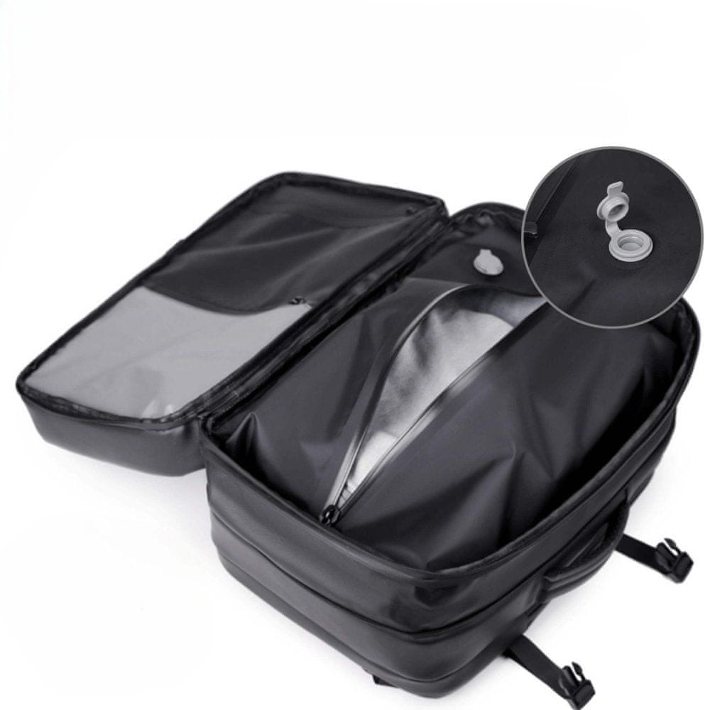 1. Inovativna vakuumska tehnologija – Učinkovita izraba prostora: Pozabite na kaos v svoji prtljagi! Zahvaljujoč vgrajenemu vakuumskemu sistemu lahko maksimalno povečate prostor v nahrbtniku. Kompresijski mehanizem vam omogoča , da zmanjšate prostornino vaših oblačil do 50 % , kar pomeni, da lahko spakirate več, ne da bi se morali odpovedati svojim osnovnim potovalnim potrebščinam. Nič več prenapolnjenih kovčkov – Focus 006 vam nudi prostor, ki ga potrebujete.