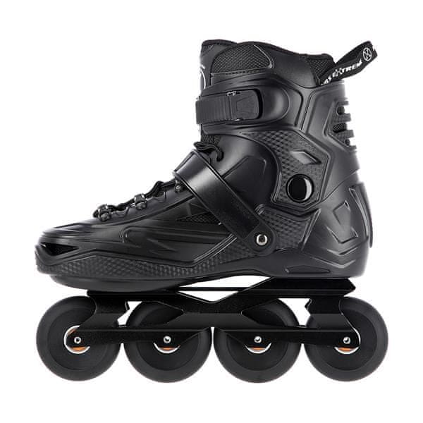 NA9786 Nils Extreme so rolerji, zasnovani za freeride drsanje. Zasnovani so tako, da zagotavljajo najboljšo možno manevriranje, natančnost gibov in stabilnost pri premagovanju slalomov. Njihova zasnova temelji na lahkem, zračnem čevlju in posebnem enodelnem, ojačanem aluminijastem tekaču. Visoko kakovosten oprijem zagotavljajo ležaji razreda ABEC9. Mehka kolesa zagotavljajo dober oprijem s podlago in dobro absorbirajo vse tresljaje. Njihova specifična konfiguracija je dejavnik, ki poveča manevriranje valja. Dve srednji kolesi sta večji od obeh zunanjih koles, kar zagotavlja večji nadzor smeri. Zapiranje je dvojna aluminijasta zaponka z zateznim mehanizmom in vezalko, zahvaljujoč kateri se čevelj popolnoma prilagodi nogi uporabnika. Na zunanji strani čevlja je poseben drsnik, ki je pogost element v freeride vožnji. Specifikacija Okvir: aluminij, enodelni CNC ležaji: ABEC9 Prtljažnik: trd s prezračevalnim sistemom Kolesa: 2 x PU 72mm/85A, 2 × 76mm/85A (velikost 36–39) 2 x PU 76mm/85A, 2 × 80mm/85A (velikost 40–44) Vložek: zračna membrana Material EVA Žametna 10 mm pena visoke gostote Dolžina vložka (mm): 217 Zapenjanje: 2 x aluminijasta zaponka z napenjalnim mehanizmom Vezanje Opombe Ni namenjeno komercialni uporabi Certifikati, standardi: CE Garancija 24 mesecev