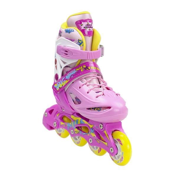 NJ11905 Nils Extreme so rolerji, namenjeni najmlajšim uporabnikom. Zahvaljujoč možnosti premikanja enega srednjega kolesa na zadnjo os, se roler funkcionalno spremeni v trikolesnik. Polmehak čevelj z ventilacijskim sistemom zagotavlja udobno uporabo. Dvodelna zaponka, Velcro trak in vezalke odlično stabilizirajo nogo v čevlju. Zahvaljujoč 3-stopenjski prilagoditvi velikosti se enostavno prilagodi nogi uporabnika. Roler je opremljen z zavoro, ki omogoča varno zaustavitev. Velikost XS ima 3 kolesa, velikosti S in M pa 4 kolesa. Specifikacija Okvir: plastika Ležaji: 608ZZ Prtljažnik: polmehak, zračen Kolesa: PVC 64 mm (XS 27–30) (S 31–34) PVC 70 mm (M 35–38) Vložek: Zračna membrana Material EVA Velvet 10 mm pena visoke gostote Notranja dolžina škornja: 175–190 mm Zapenjanje: dvodelno zaponka Velcro trak Zavezovanje Skate opremljen z zavoro Opombe: Ni namenjeno komercialni uporabi Certifikati, standardi: CE 24-mesečna garancija