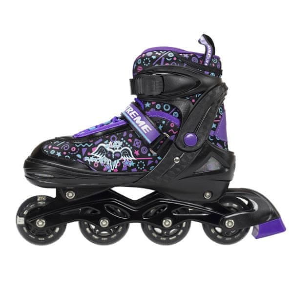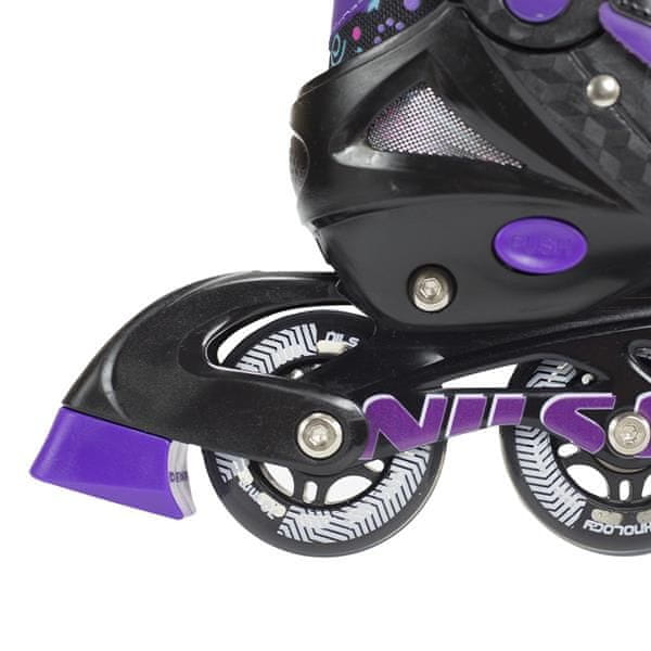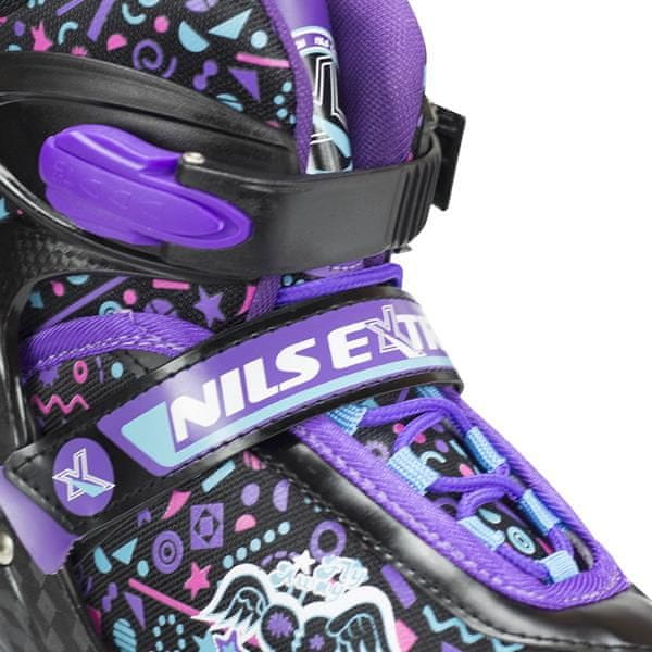 NJ4613 Nils Extreme so rolerji, namenjeni najmlajšim uporabnikom. Izdelek je kombinacija zanimivega dizajna in visoke kakovosti izdelave. Na voljo je v treh privlačnih barvnih različicah. Polmehki škorenj zagotavlja udobje, medtem ko vezalke, zaponka in trak na ježka zagotavljajo maksimalno varnost med vožnjo. S preprostim sistemom prilagajanja lahko enostavno in hitro prilagodite velikost čevlja uporabnikovi nogi. Roler je opremljen s posebnim aluminijastim tekačem in zavoro, ki zagotavlja varnost med vožnjo. Kolesa in ležaji razreda ABEC7 pa omogočajo manjši kotalni upor, torej hitrejšo vožnjo. Poleg tega ima NJ4605 sprednje LED kolo, tako da bo vaš otrok viden tudi po temi. Specifikacija: Ogrodje: aluminij Ležaji: ABEC7 Prtljažnik: polmehko Kolesa: PU 64 mm/24 A (velikost S 30–33) PU 70 mm/24 A (velikost M 34–37) PU 70 mm / 24 A (velikost L 38–41) Vložek: Zračna membrana Material EVA Velvet 8 mm pena visoke gostote Notranjost dolžina čevlja: 190–210 mm Zapenjanje: Plastična zaponka Velcro Vezanje Drsalka je opremljena z zavoro Opombe: Ni namenjeno za komercialno uporabo Garancija 24 mesecev
