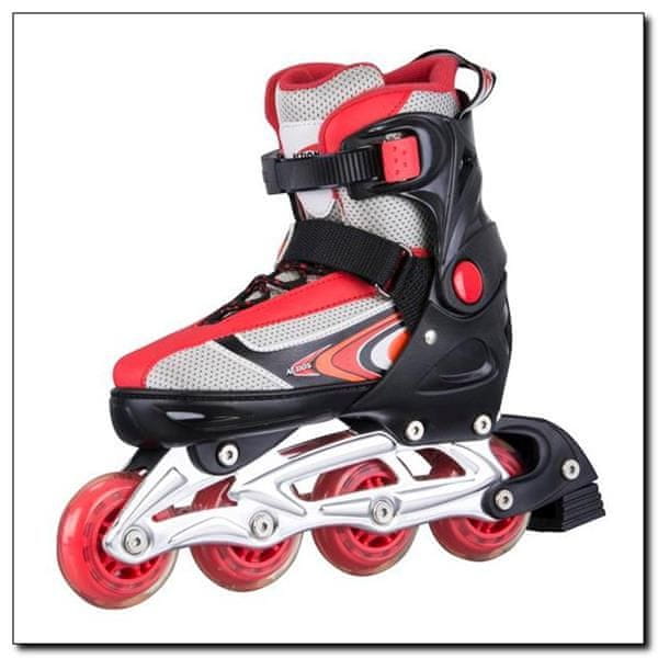 PW-126B so rolerji, namenjeni najmlajšim ljubiteljem drsanja. Izdelek je kombinacija zanimivega dizajna in visoke kakovosti izdelave. Lahek in trpežen čevelj s sistemom trakov (velcro, dvodelna zaponka) zagotavlja maksimalno varnost. S preprostim sistemom prilagajanja lahko enostavno in hitro prilagodite velikost nogi uporabnika. Roler je opremljen s posebnim aluminijastim okvirjem in ležaji ABEC5. Model je na voljo v treh barvnih različicah. Tehnični podatki Ogrodje rolerjev: aluminij Ležaji: ABEC 5 Kolesa: 64 mm/ 72 mm/ 76 mm* PU čevelj: pol mehak Zapenjanje: dvodelna zaponka Zavezovanje s trakom Velcro Rolerji opremljeni z zavoro Barva: roza, črna, rdeča Velikosti: Roza: XS(29–32) S(33–36) M(37–40) Črna: S(33–36) M(37–40) L(40–43) Rdeča: XS(29–32) S(33–36) M(37–40) L(40–43) Opombe Ni namenjeno komercialni uporabi Certifikati, standardi: CE Garancija 24 mesecev